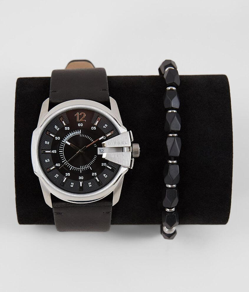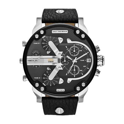 Buy diesel mens stainless steel quartz watch with leather strap black 26 model. A multi layered top ring and pushers and a distressed black leather strap set the stainless steel diesel heavyweight chronograph watch apart from the pack. These bands are characterized by the use of robust luxurious but mainly natural materials.