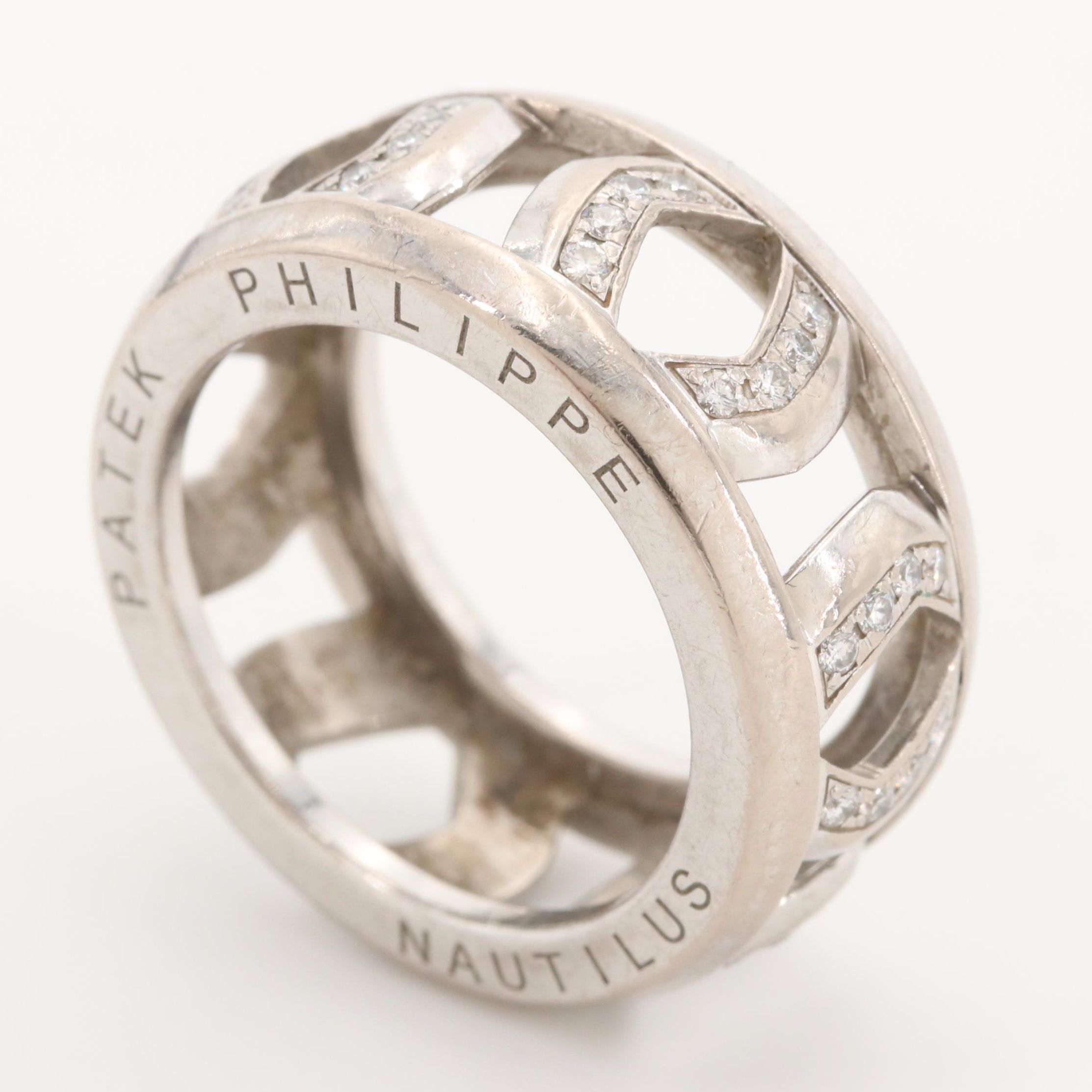 Patek philippe nautilus ring. A 34 mm 18k white gold nautilus ladies wristwatch silver dial with applied hour markers and applied arabic number 12 date at 3 0clock a fixed 18k white gold bezel set with 46 round brilliant cut diamonds 077ct an 18k white gold bracelet with a concealed 18k white gold double deployant clasp sapphire glass quartz movement in excellent condition comes complete with a patek philippe box and papers dated march 2013. The precision of the cut is also vital in ensuring a regular and even setting. 7200 in delicate rose gold is a ladies wristwatch fully focused on hours and minutes. The clarity of the diamonds is always of the desirable internally flawless grade known as if and exhibits an immaculate cut.